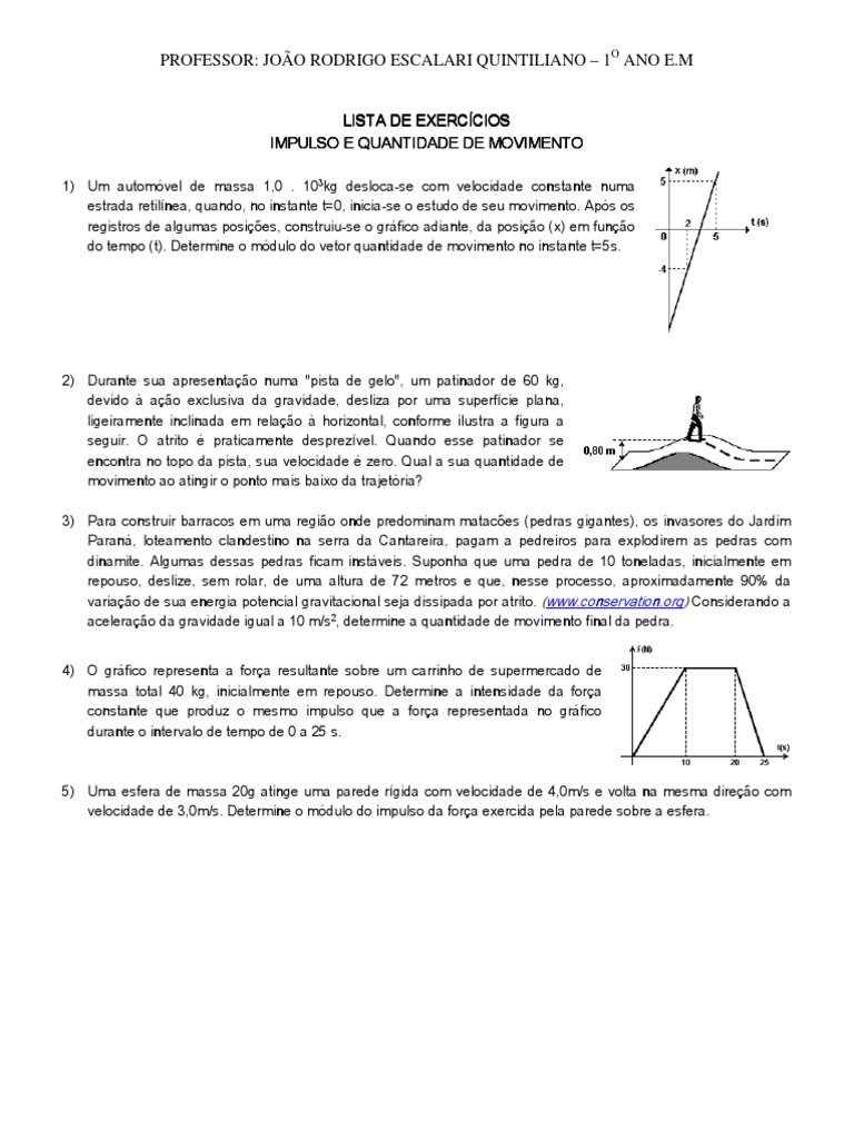 Impulso quantidade de movimento exerccios de aplicao. Nessa aula, vamos falar do teorema do impulso e quantidade de movimento, relacionando a fórmula utilizada com outras já conhecidas e fazendo um exercício. A quantidade de movimento também é chamada de momentum ou momento ou ainda, momento linear. Henrique dantas impulso é a grandeza física vetorial relacionada com a força aplicada em um corpo durante um intervalo de tempo. Entenda como funciona o impulso e quantidade de movimento da mecânica clássica. Para esse observador, com que velocidade, especificada em módulo e sentido, o corpo se move imediatamente após o impulso? Atuando durante um intervalo de tempo. Considerando a aceleração da gravidade igual a 10 m/s2, a quantidade de movimento final da pedra em kg m/s é, aproximadamente, igual a Da mesma forma que havia uma relação. Ambas são grandezas vetoriais, portanto possuem módulo, direção e sentido. Deste modo, imagine um carrinho de bebê (pouca massa) desgovernado e um caminhão (muita massa), também desgovernado. A unidade de medida de ambos é a quando se aplica um impulso a um corpo, sua quantidade de movimento muda. Esse artigo sobre impulso e quantidade de movimento foi útil para você e para os seus estudos?